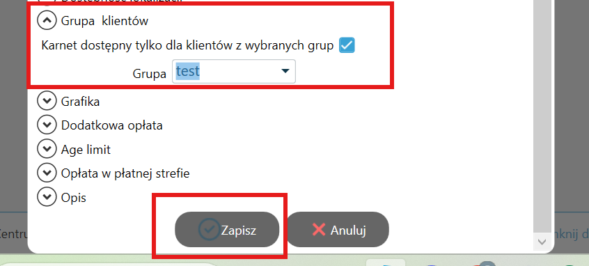 Następnie: "Edytuj", w oknie edycji karnetu w zakładce "Grupa klientów" zaznaczyć opcję "Karnet dostępny tylko dla klientów z wybranych grup" i wybrać właściwą grupę z listy. Następnie kliknąć "Zapisz".