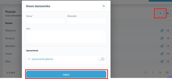 Aby dodać nowe stanowisko: kliknij "+", wpisz nazwę, obowiązki i opis, wybierz uprawnienia i kliknij "Zapisz".